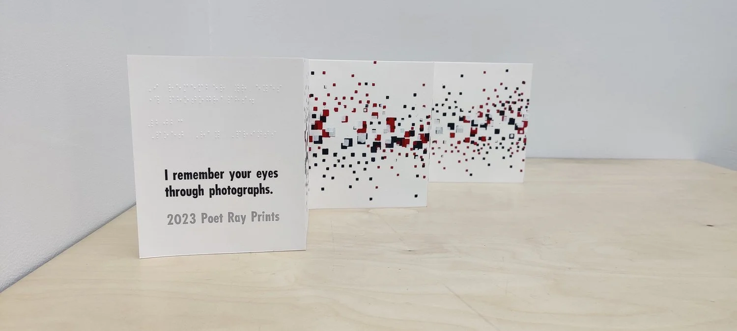 This accordion-fold book includes four interior pages of emulsion lift portraits in color of people in my life: my partner, myself, my parents, and my friend. Below their portrait is the fading words, “look me in the eyes.” Over their eyes, printed in braille, are the same words. On the last two interior pages is a poem written first in braille and then in print that reads, “I perform the act / of eye contact, / of vigor and tact, / of how to react.” The cover page is blind-embossed with the words “eye contact” and the back cover page includes a colophon written in braille and print that reads, “I remember your eyes through photographs. 2023 Poet Ray Prints.” Along the back of the interior pages is a stenciled static pattern in white, black, and red.