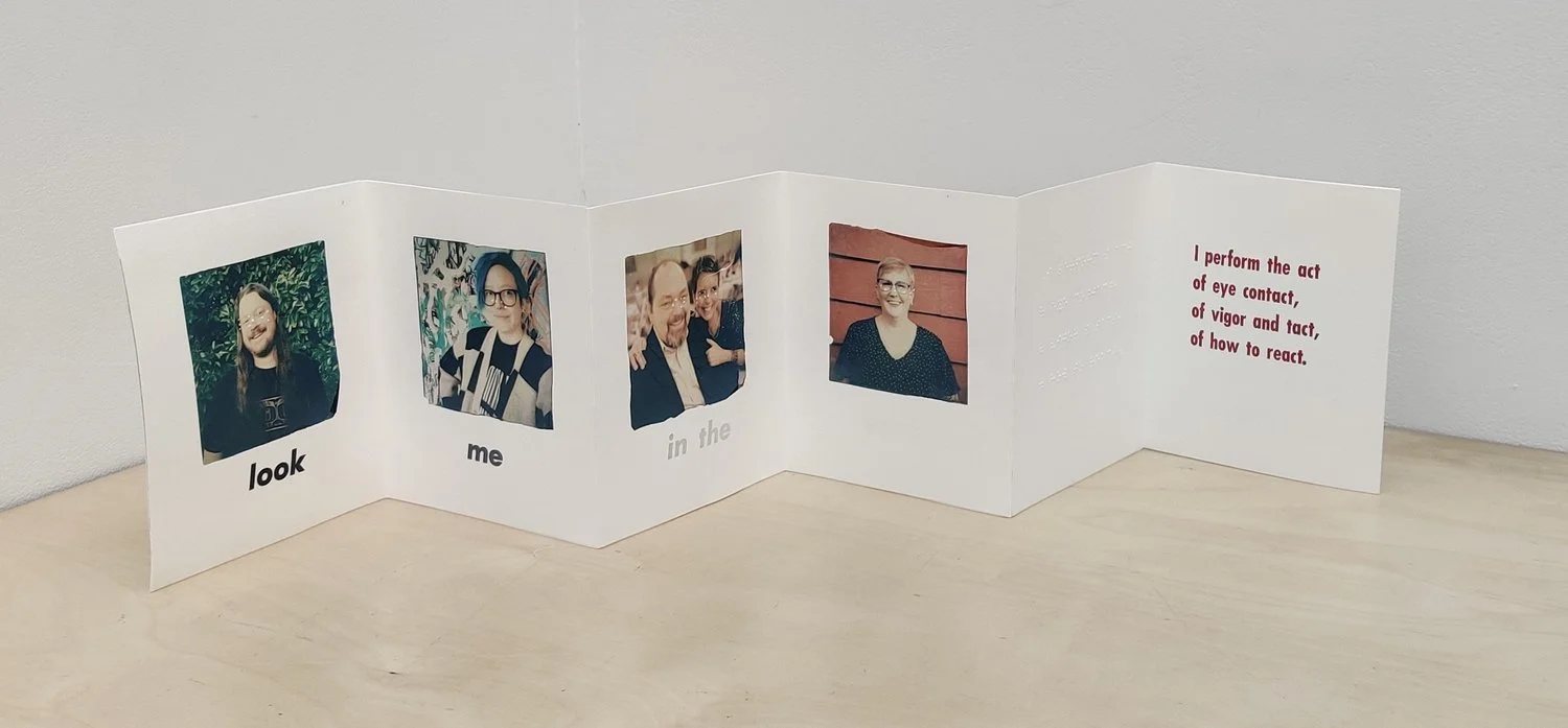 This accordion-fold book includes four interior pages of emulsion lift portraits in black and white of people in my life: my partner, myself, my parents, and my friend. Below their portrait is the fading words, “Look me in the eyes.” Over their eyes, printed in braille, are the words, “Can’t you see I’m trying?” Each panel plays with this conversation, with the first page reading “Can’t” in braille and “Look” in text. The second panel reads “you” in braille and “me” in text. The third, “see I’m” in braille and “in the” in text. The final page, “trying?” in braille and “eyes” in text.