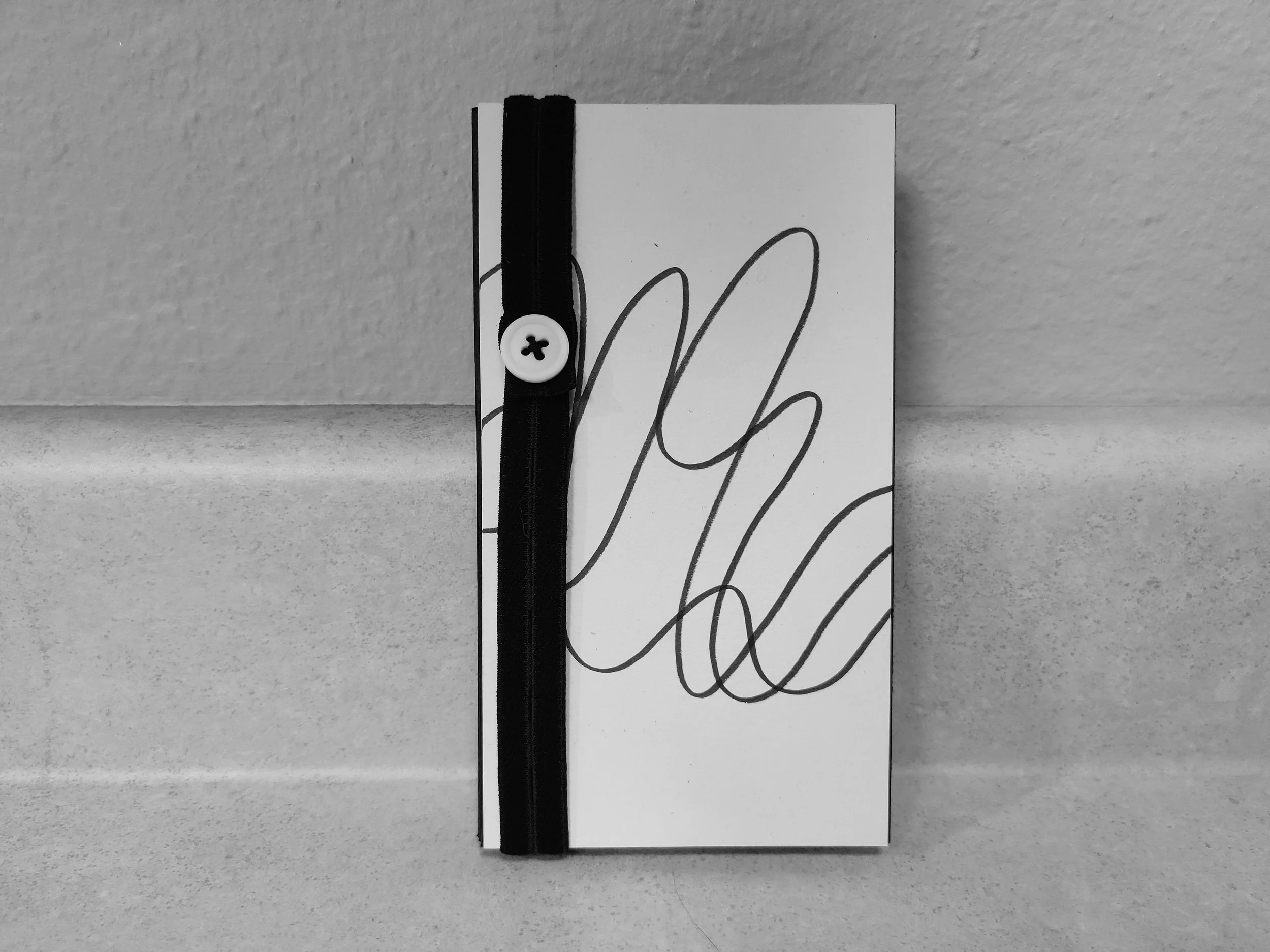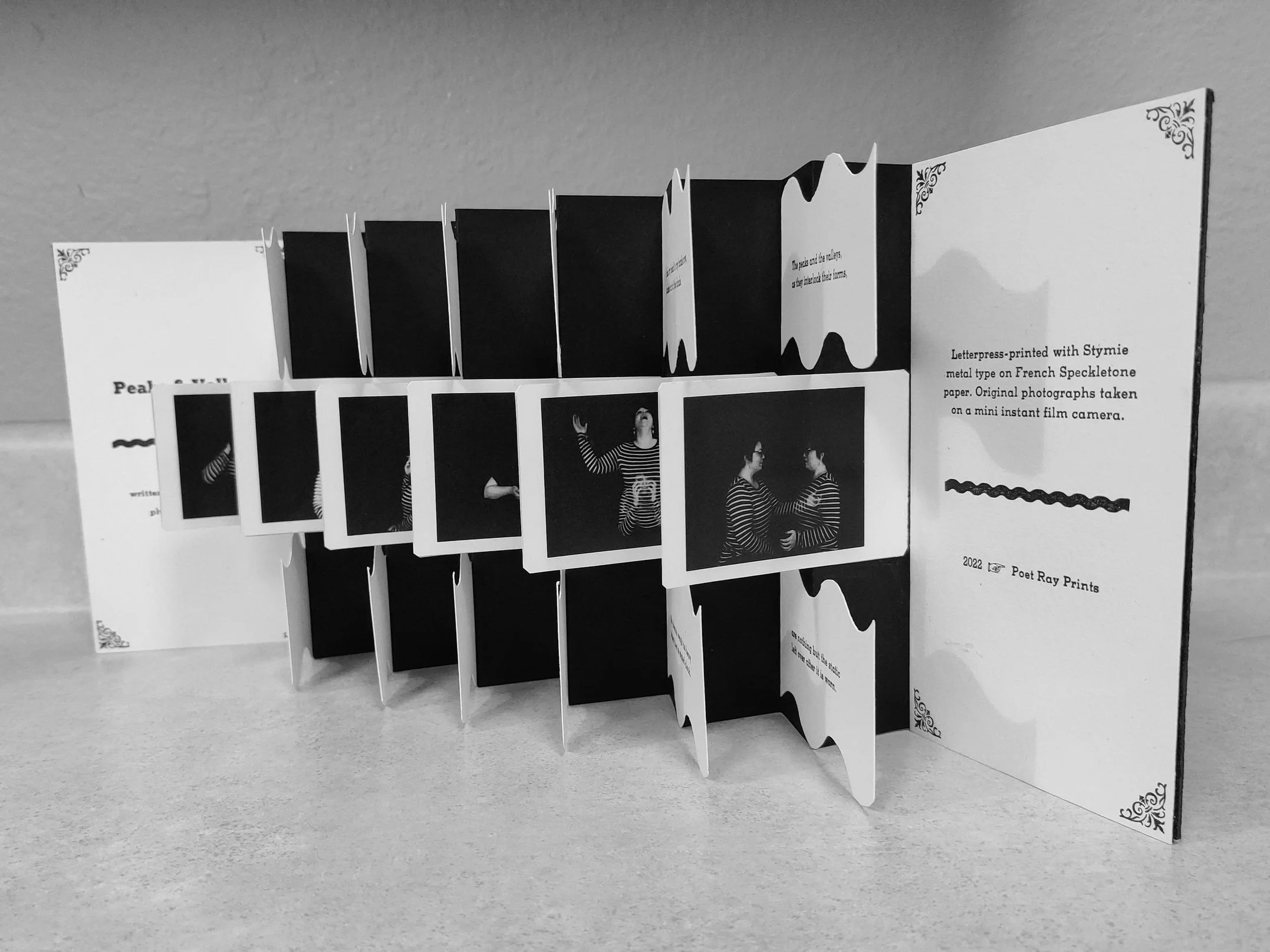The text is letterpress-printed using Stymie metal type on French Speckletone paper. Stanzas of the poem are divided between two wavy shapes and accompanied by digital reproductions of the mini instant film photographs. The cover is reinforced with black chipboard. On the outside is a hand-drawn image of three, overlapping waves. On the inside panels are the title page and colophon. The book is held together with a black, button-hole elastic band and a white button.